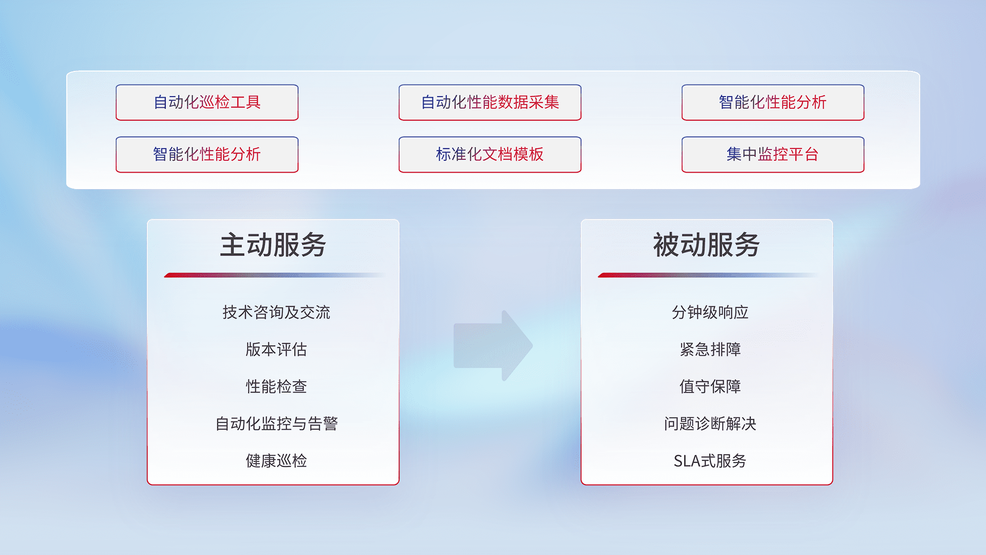 智能化工具和标准化文档,,,保障服务质量,,,提供主动服务(包含技术咨询、、版本评估、、、性能检查、、、自动化监控与告警、、健康巡检)和被动服务包含(分钟级响应、、、、紧急排障、、值守保障、、问题诊断解决、、SLA服务)。。。。